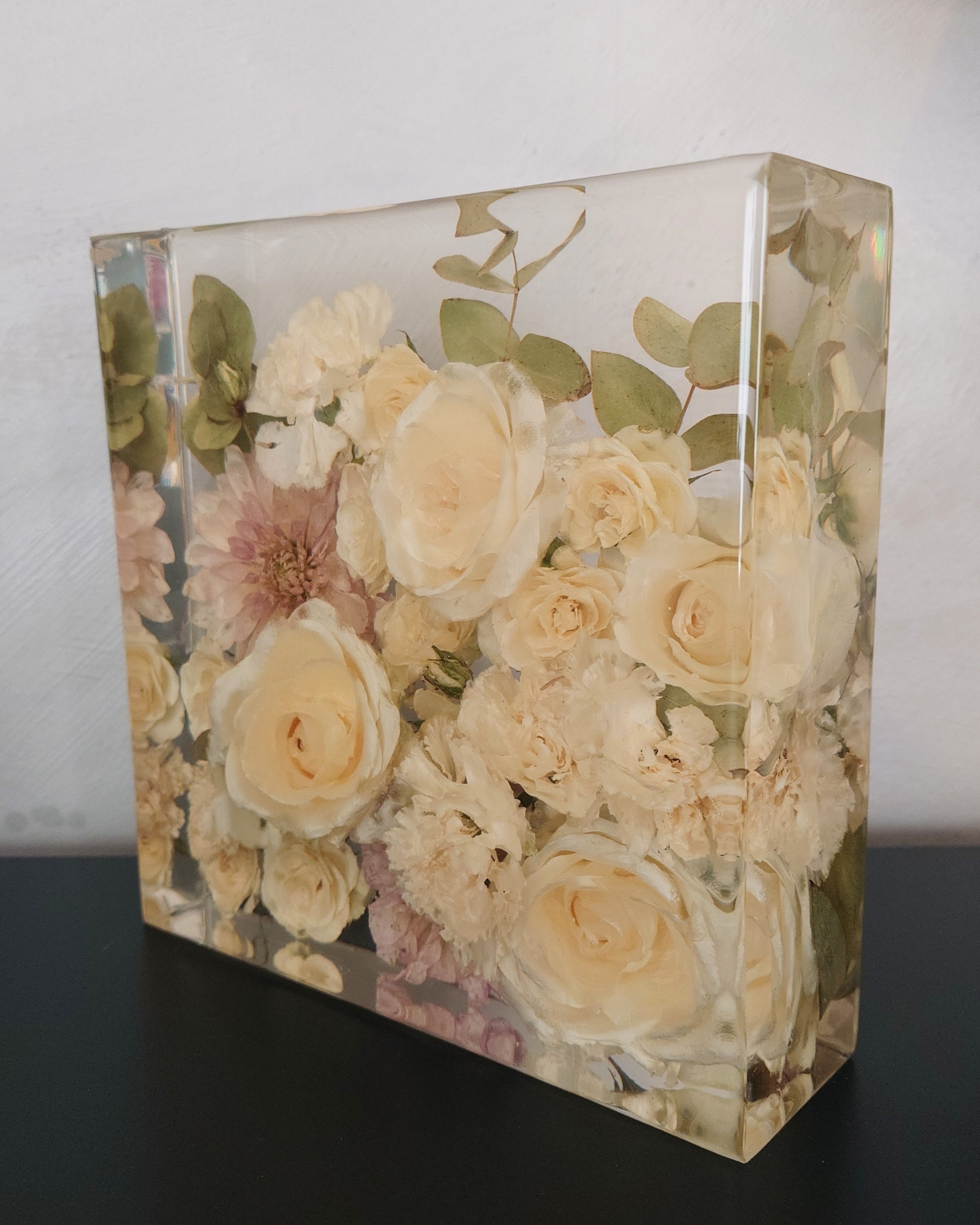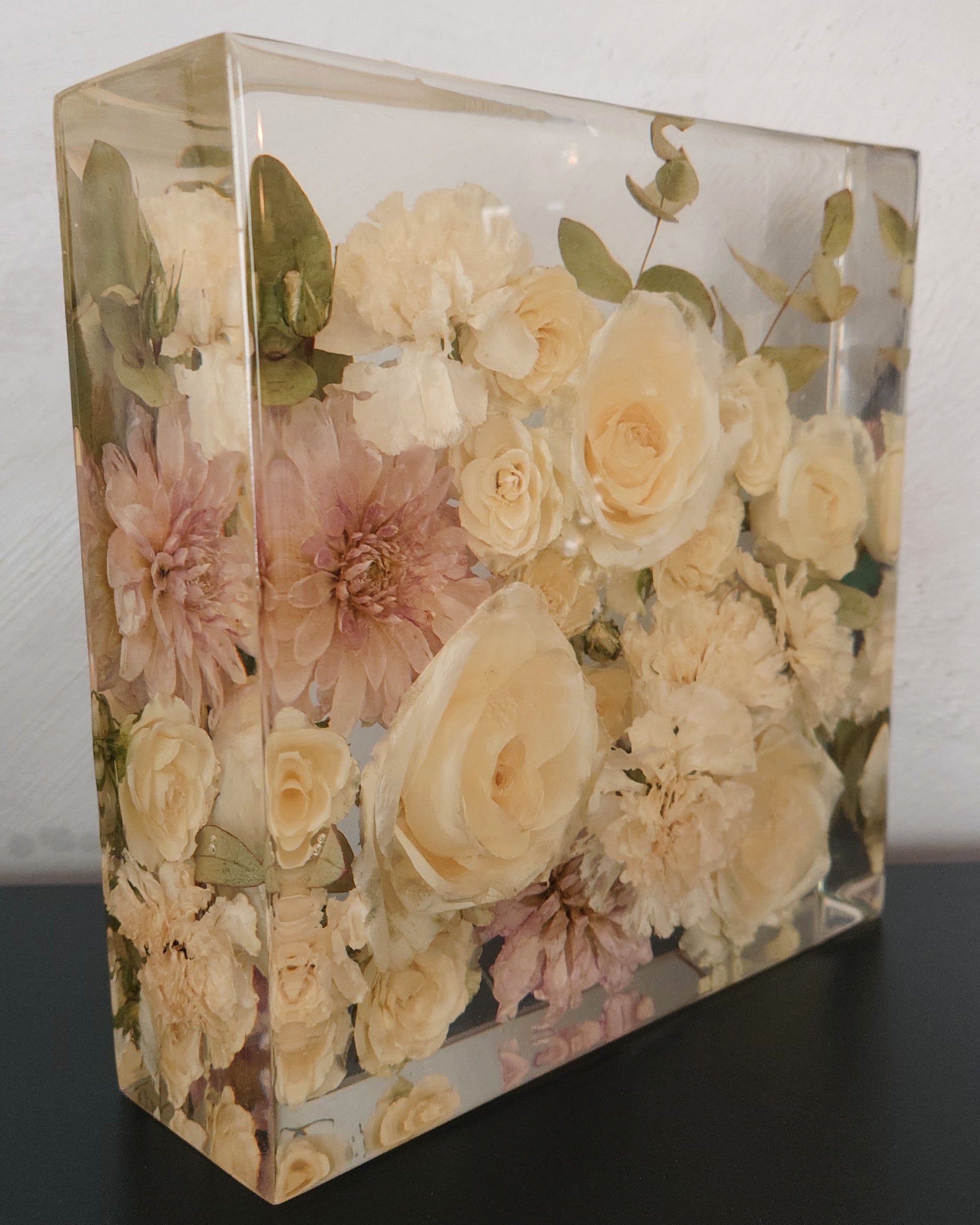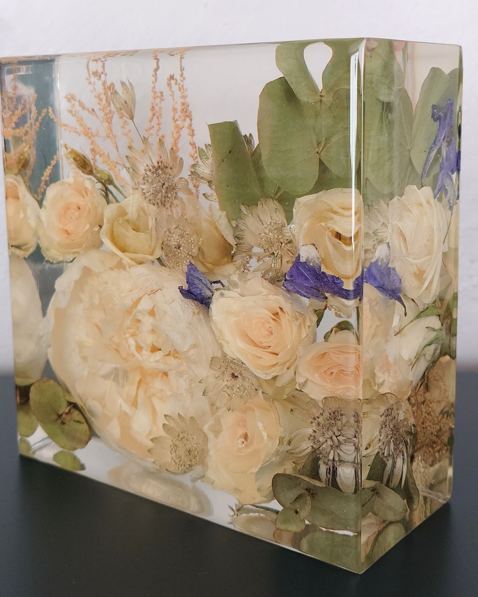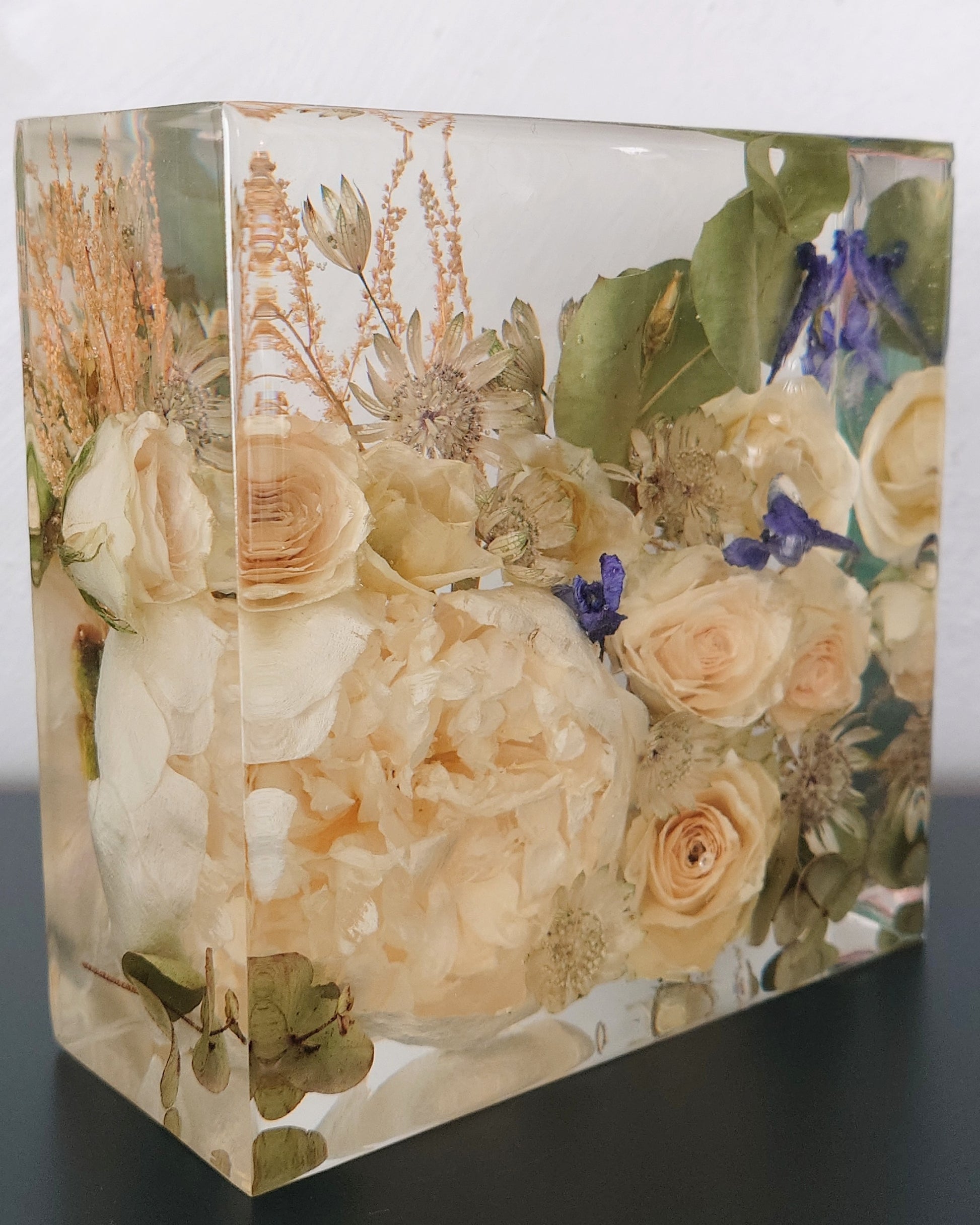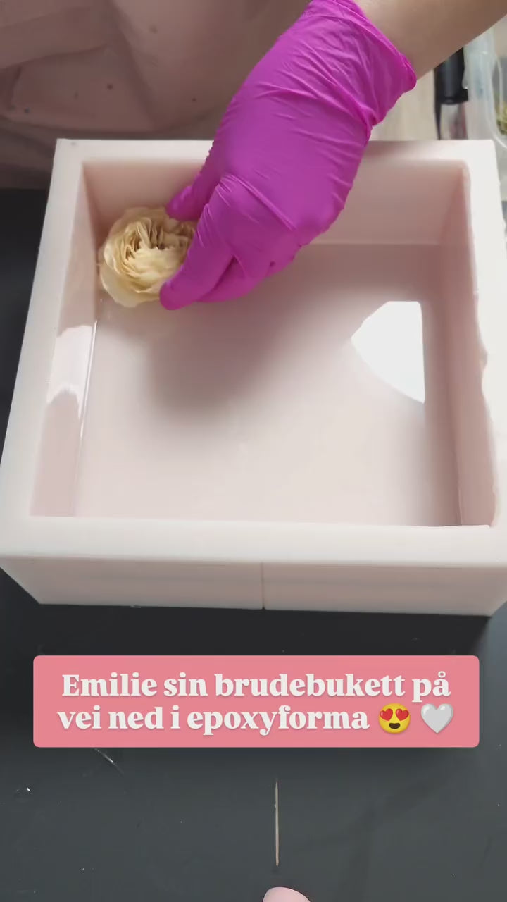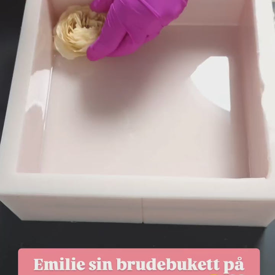 OBS 2: De fleste blomster mørkner mer eller mindre i farge når de blir tørket. Hvis de er håndtert mye kan de få "blåmerker" som kan sees som transparente områder når de blir støpt i epoxy. Dette er en del av sjarmen med å tørke blomster, og noe av det som gjør hver preservering unik.
