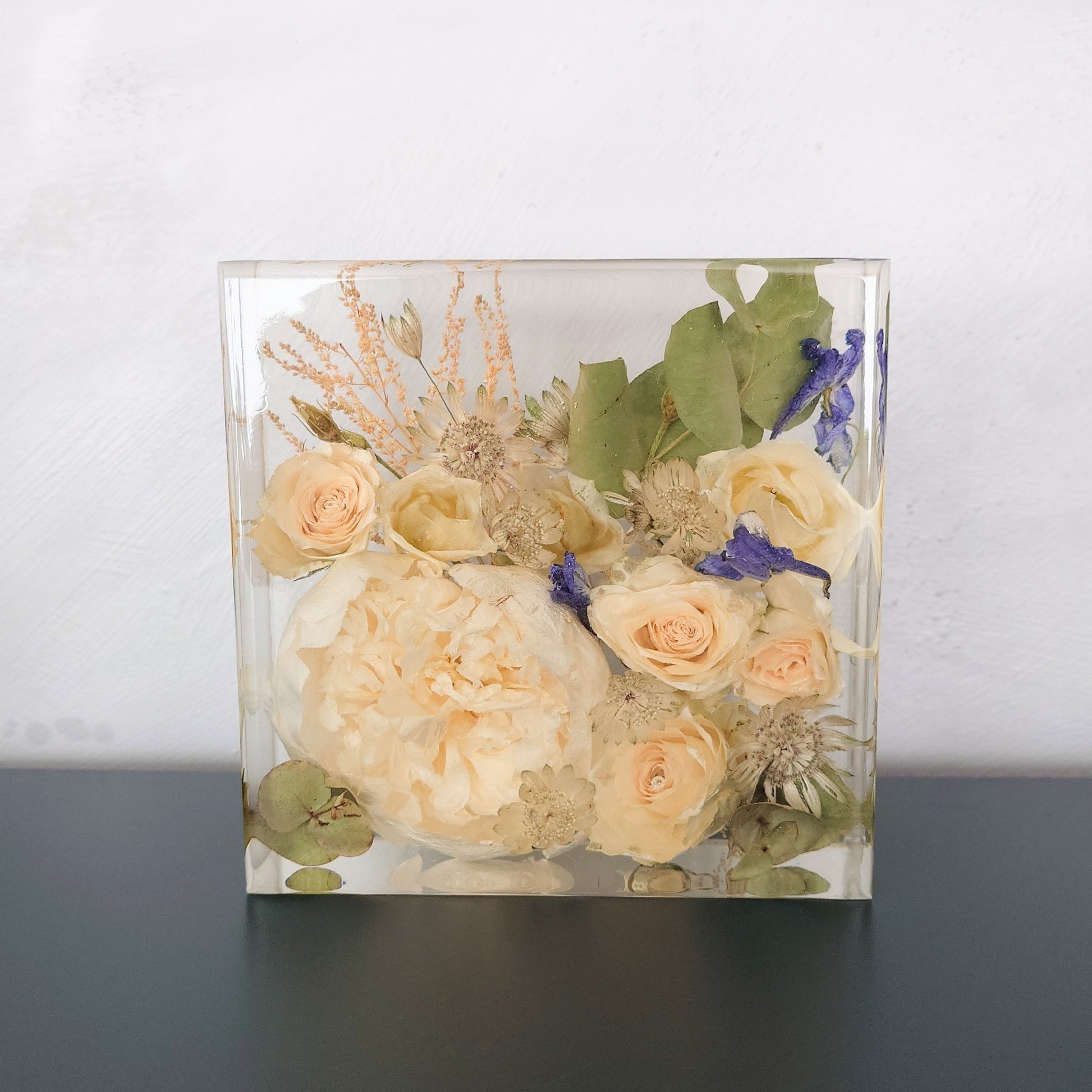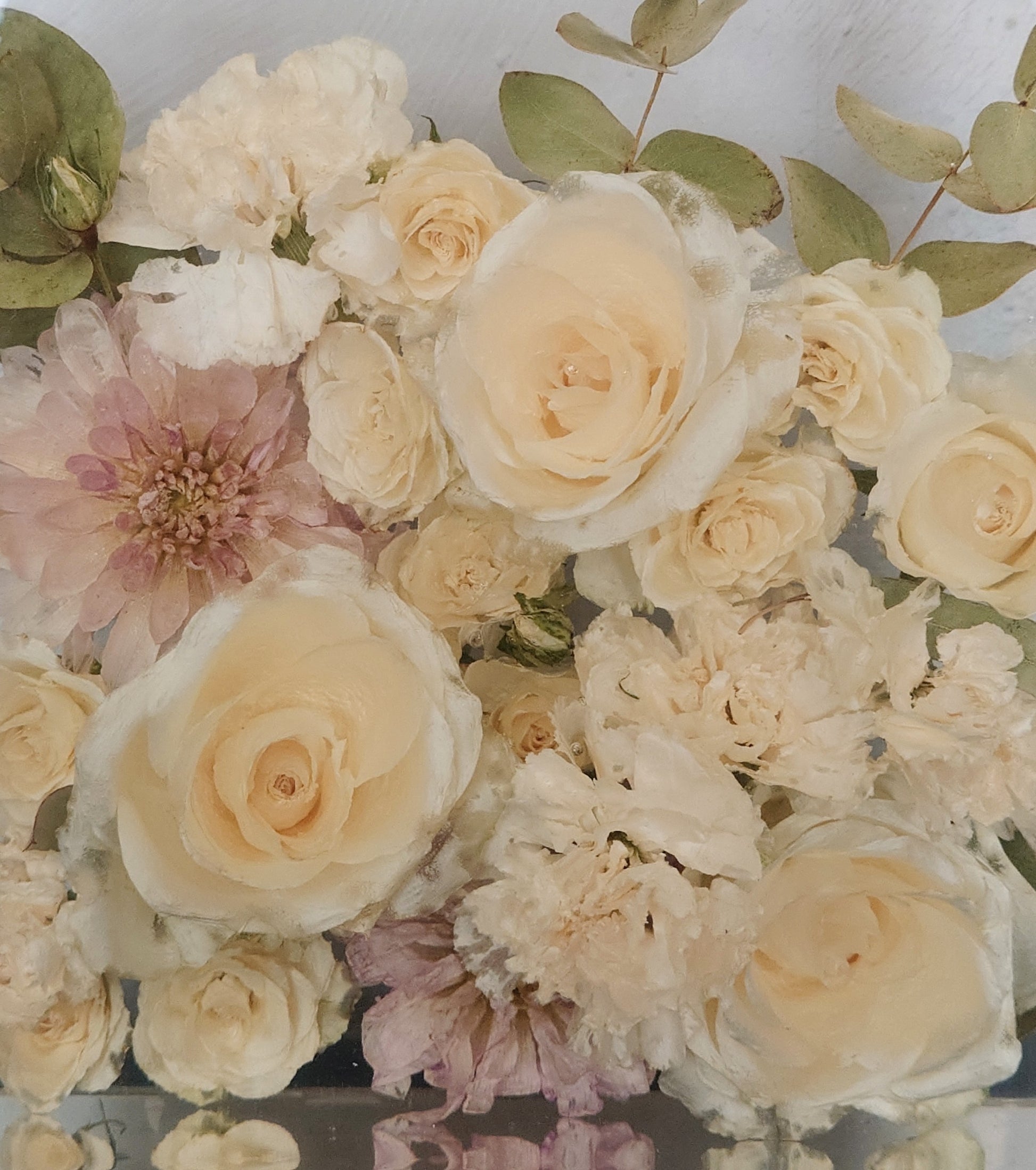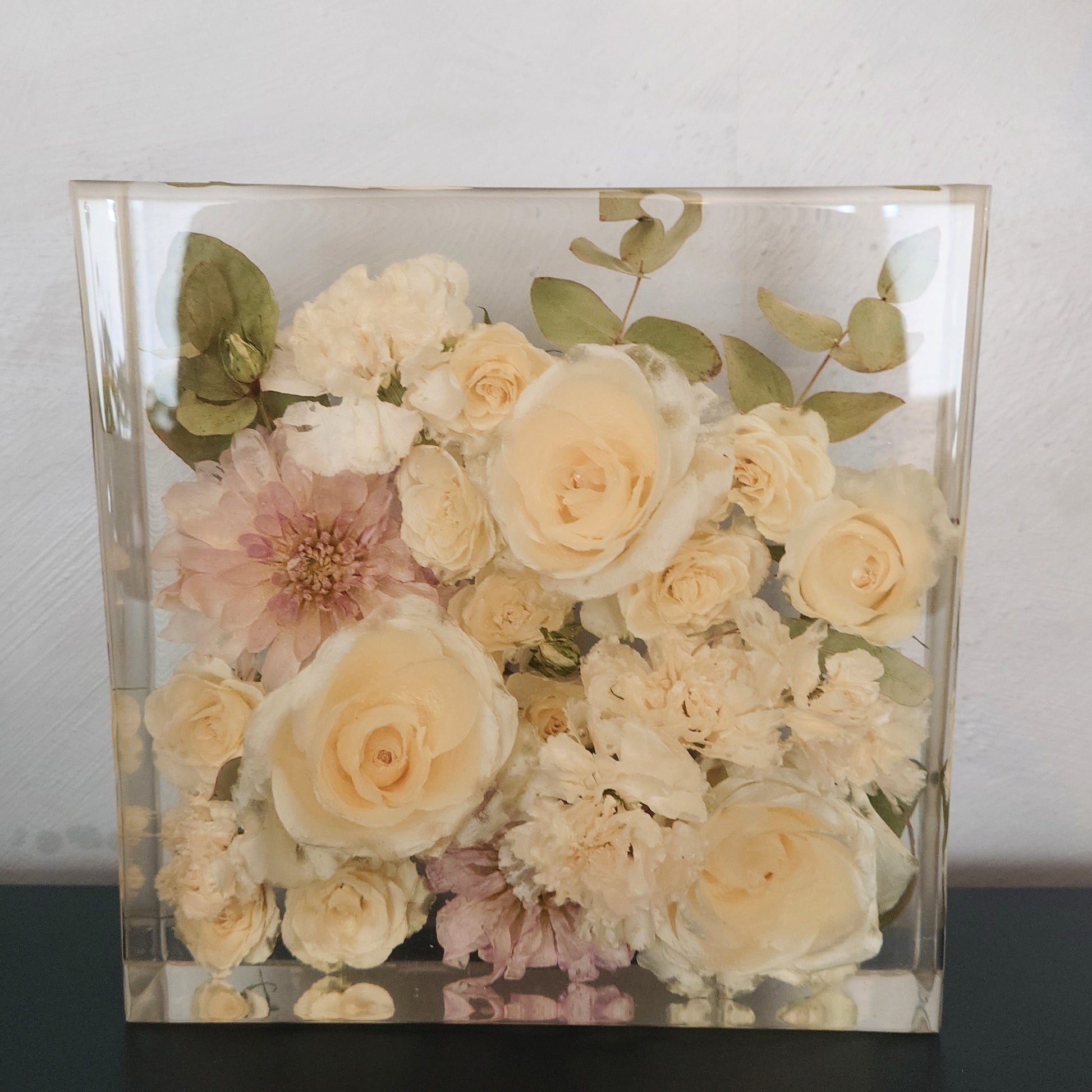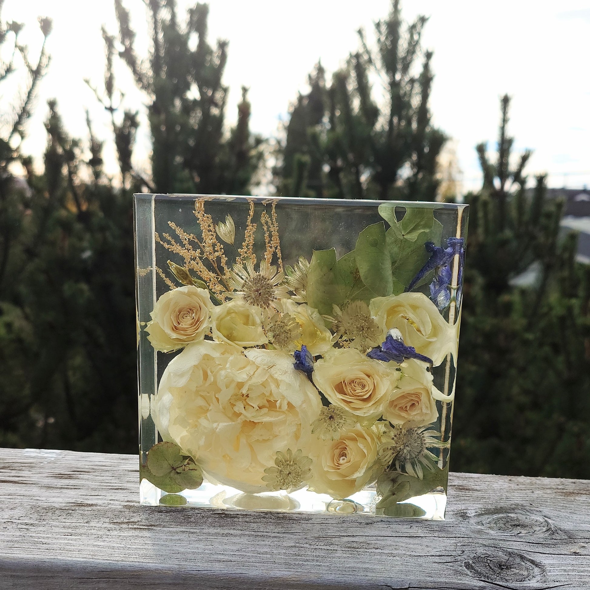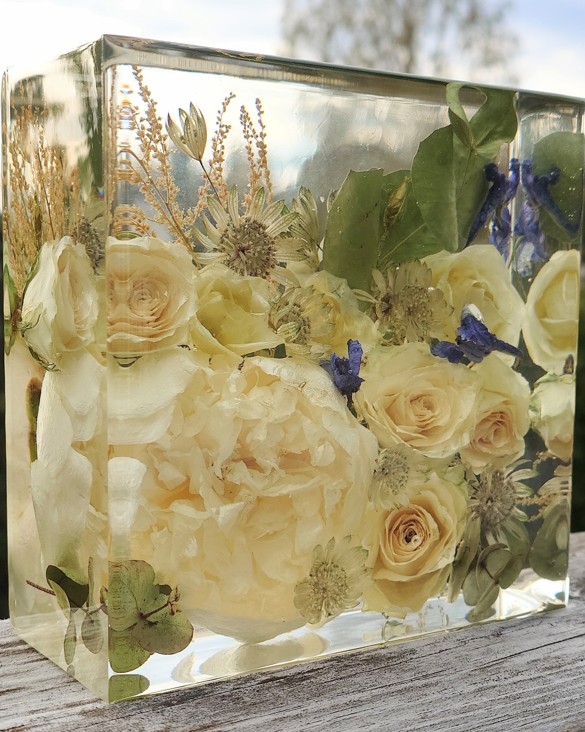 OBS 2: De fleste blomster mørkner mer eller mindre i farge når de blir tørket. Hvis de er håndtert mye kan de få "blåmerker" som kan sees som transparente områder når de blir støpt i epoxy. Dette er en del av sjarmen med å tørke blomster, og noe av det som gjør hver preservering unik.