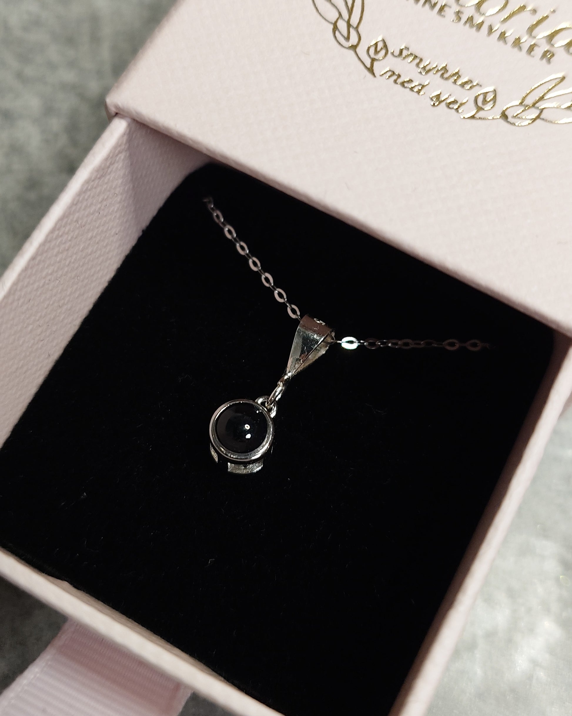 Dette smykket i 925 sterlingsølv gjemmer på en hemmelighet. I den svarte perla kan du nemlig få ditt eget bilde i miniatyr.